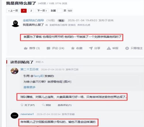 有志气的吉林球迷非常不情愿甘当辽宁小弟,一位吉林球迷失望地说,又不是不能接受输,以前又不是没输过辽宁,好好拼下来然后输了又没啥,非得故意放,完了还不告诉栾利程。人家其他区球迷骂你二队、儿子、小弟,我都没法还嘴,就今天对面儿这状态再加上栾的爆种,上小姜再好好轮换,是很有希望拿下的,本应该止住连败的是我们啊......我算是看明白了。