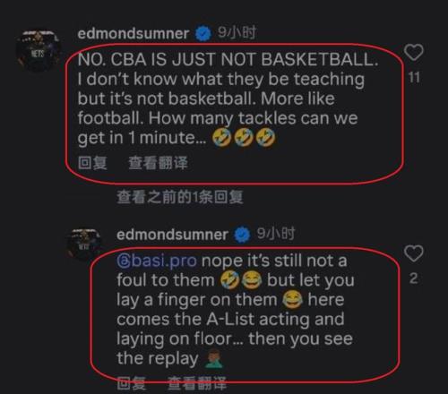 萨姆纳在个人网络平台上是这样写道:“CBA联赛,并不像是一个篮球联赛,而是像一个橄榄球联赛,说实话,我真的不知道这些球员是怎以学习篮球的,他们可以在一分钟之内多次擒抱你……但是,就算是这样,裁判员也不会吹对方犯规!然而,当你要进行回应,碰了他们一下,那么,他们就会倒在地上,要求裁判员进行录像回看……”
